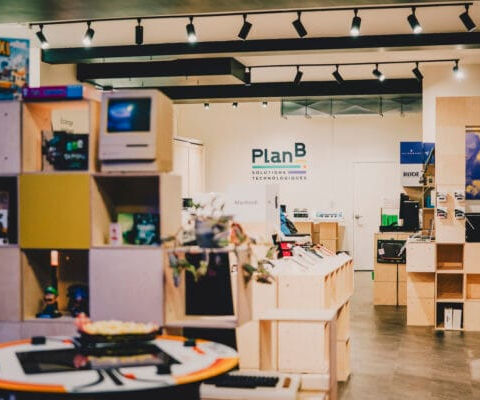 Construction d'un espace commercial au design contemporain pour la boutique Pixel / Plan B. Un projet clé en main qui allie fonctionnalité et identité visuelle forte.